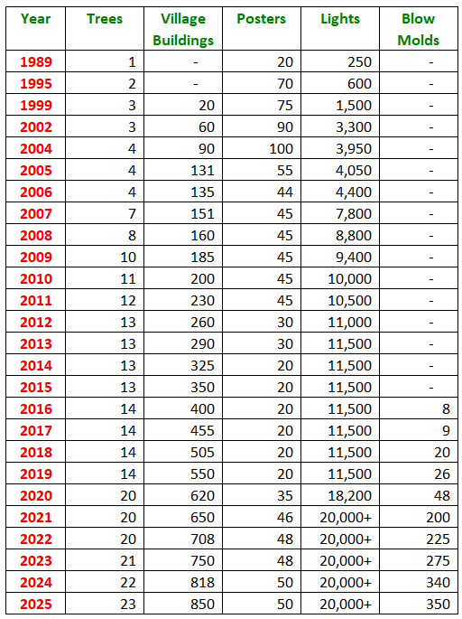 The Christmas Village was founded in the late 1980s by Christmas enthusiast Wayne Groff. At that time, there was just a small forest display, some posters, and small Christmas tree occupying a bedroom. Since then, it has grown into the overwhelmingly beautiful display you enjoy today, with a huge Village which is its namesake, even though the entire experience is known as “Christmas Village”. Join us at the Christmas Village 2025 to celebrate another year of Christmas jubilation. Relish that Christmas Village has a certain magic in it; it is meant to inspire you and remind you of your childhood dreams and fantasies of Christmastime. The Christmas Village within the Village has again expanded for the 25th consecutive year; we’ve added over 30 new buildings- now with over 800 lighted buildings and rides, and 15 trains on a 700+ square foot display! Folks, it’s truly huge. Christmas Village is again simply the best it’s ever been in its 25+ years of existence. Welcome to the merriment!